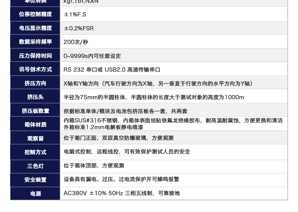 用途:電池包擠壓試驗機模擬各類動力動力電池包和系統在運輸、儲存及使用過程中電池包遭受碰撞擠壓的情形,人工呈現電池在遭受擠壓時可能出現的不同狀況。