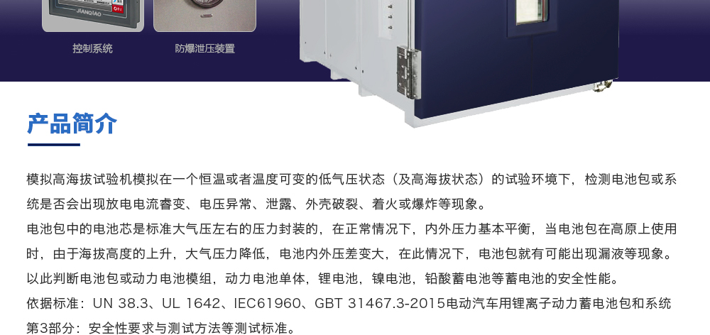 用途:模擬高海拔試驗機模擬在一個恒溫或者溫度可變的低氣壓狀態(tài)(及高海拔狀態(tài))的試驗環(huán)境下,檢測電池包或系統(tǒng)是否會出現(xiàn)放電電流睿變、電壓異常、泄露、外殼破裂、著火或爆炸等