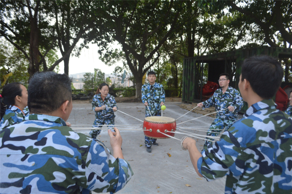 第三個項目:鼓動人心。一只大鼓周邊系滿了繩子,兩組隊員,每人一組十人合力拉緊繩子把鼓拉起,在鼓上放一只網(wǎng)球,利用鼓的彈性將網(wǎng)球彈起高于5cm的距離,一分鐘內(nèi)哪組彈起的次數(shù)多者獲勝。比賽時所有人員的都全神貫注于網(wǎng)球的起落和全力控制鼓的移動及上下,項目對于團隊溝通協(xié)作起到了很好的啟示作用。