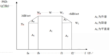 設w=wb+w1=0.2g²/Hz,fa=10Hz,fb=20Hz,f1=1000Hz,f2=2000Hz,由于fa 的wa 升至fb 的wb 處,斜率是3dB/oct,而wb=0.2g²/Hz,所以wa=0.1g²/Hz。