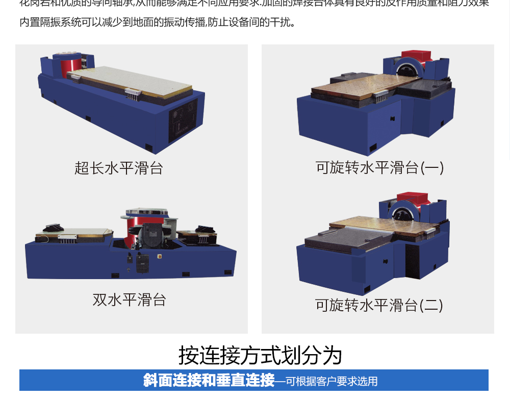 用途:振動(dòng)臺(tái)配置水平滑臺(tái)可以實(shí)現(xiàn)三向振動(dòng)試驗(yàn),也可以配合溫濕試驗(yàn)箱形成復(fù)合環(huán)境試驗(yàn)系統(tǒng)。多軸向水平滑臺(tái)可以與任何振動(dòng)臺(tái)配用,為水平方向測(cè)試提供最佳的試驗(yàn)平臺(tái)。根據(jù)一體化理